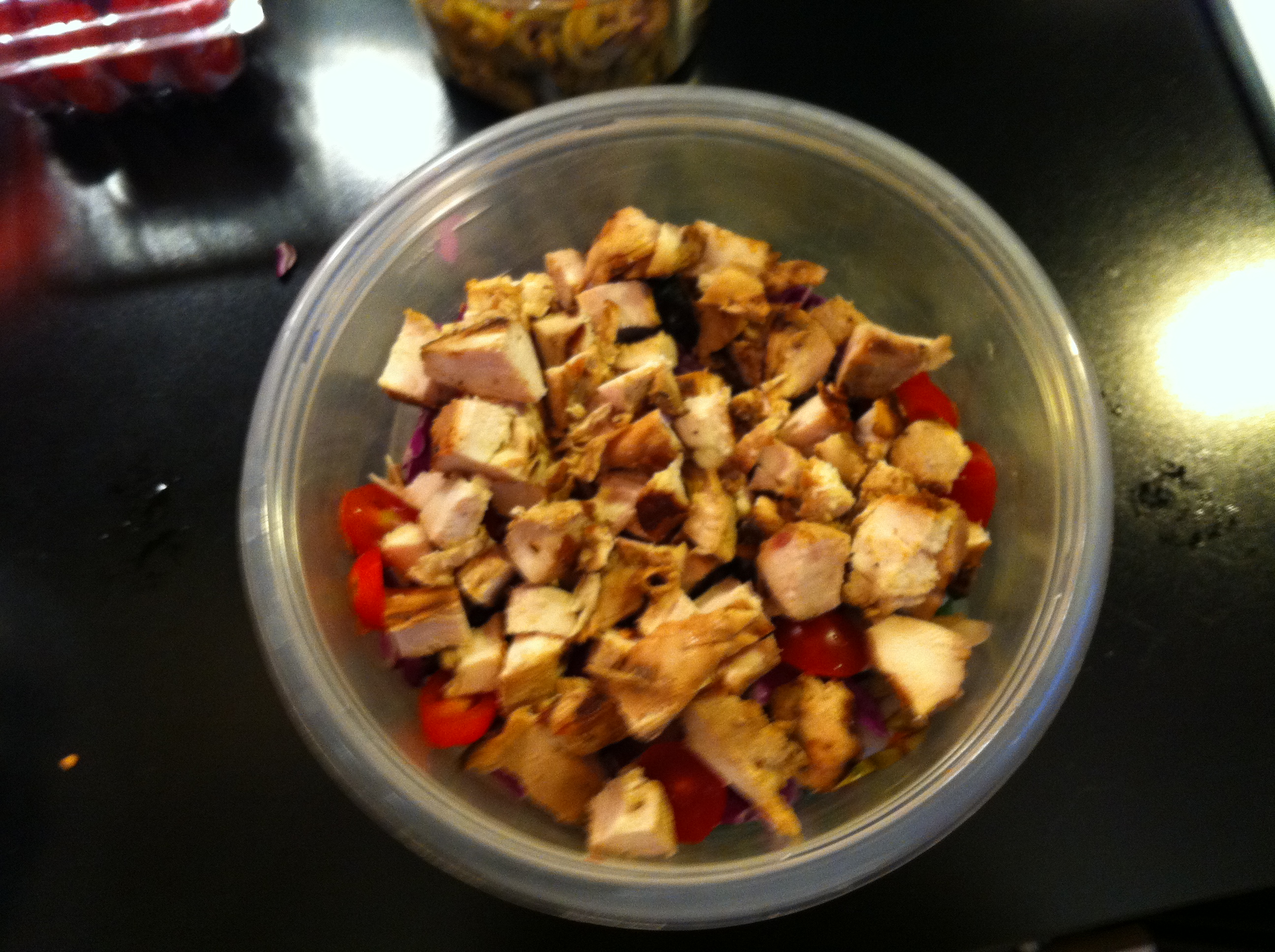 Lunch is always a green salad topped with about five ounces of grilled chicken and olive oil as dressing.