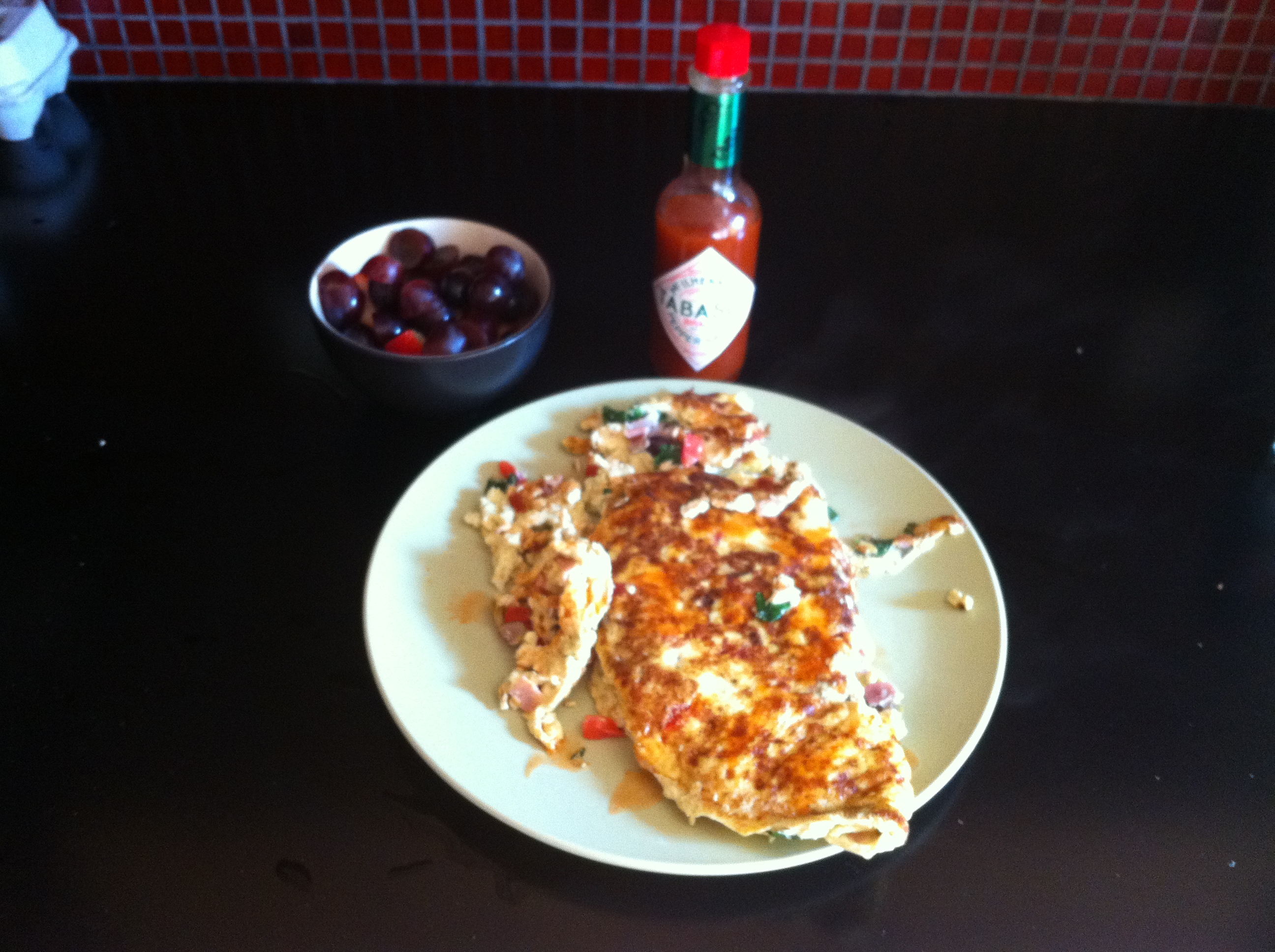 Breakfast consists of an omelet prepared with two omega-3 eggs, four egg whites, about two ounces of ham, and a handful of spinach, tomatoes, mushrooms and whatever other veggies are in the fridge. I also have a cup of fruit, usually strawberries.