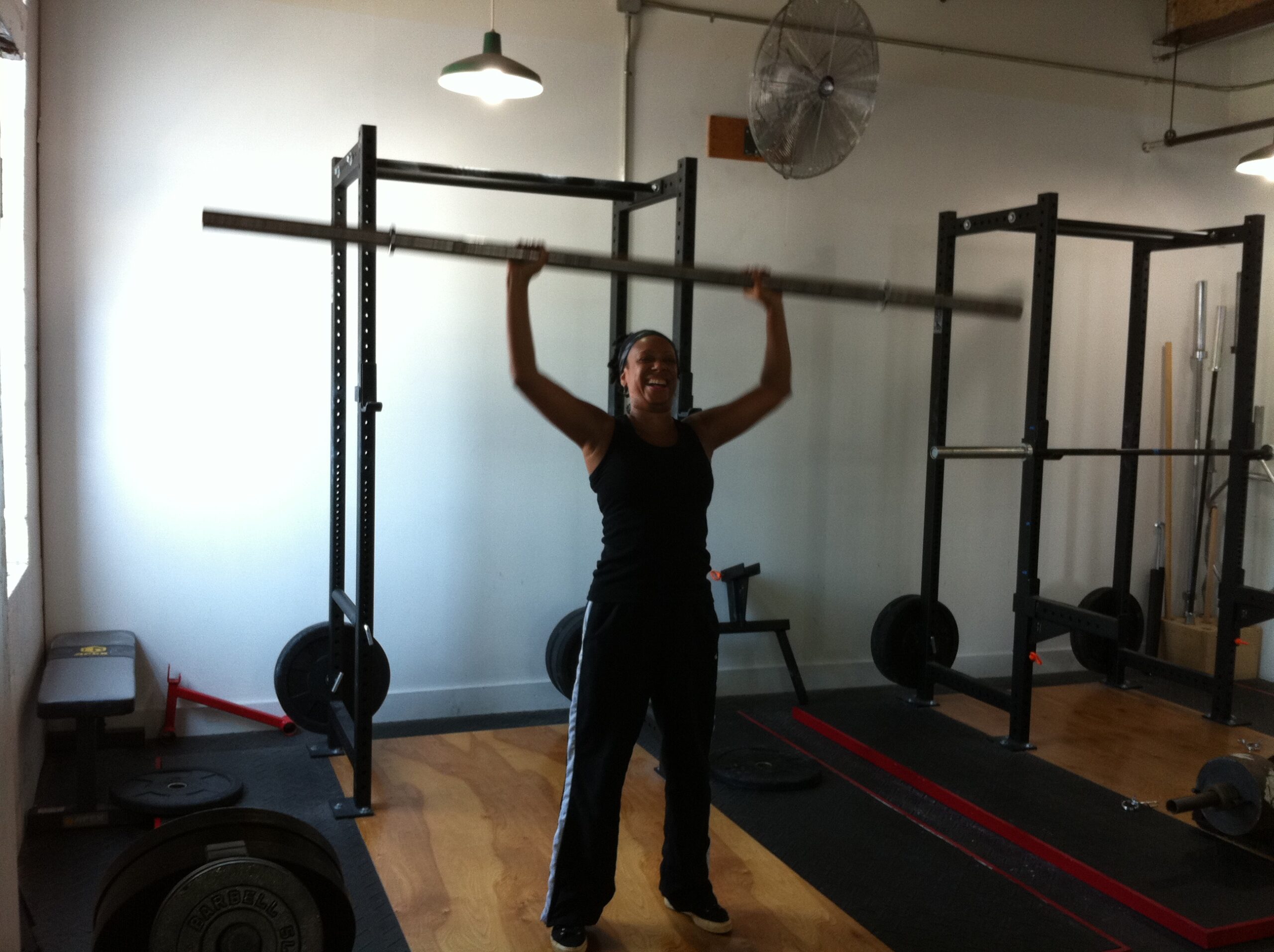 over your head!) The bar was a 2″ axle weighing about 35 pounds. It was quite demanding for the ladies whose hands were much smaller than the guys…talk about grip work! After everyone successfully cleaned and pressed the bar, then the fun began. We added weight. Then more weight. Then more weight. Eventually, some of us just deadlifted the bar….no way were we able to clean it! Mike kept adding weight until the last man standing failed to press the bar. It took a while but Jarreau finally hit the wall. Of course, he had close to 200 pounds on the bar by then!! Two of the ladies (myself included!) deadlifted 203 pounds. Celebration!!!