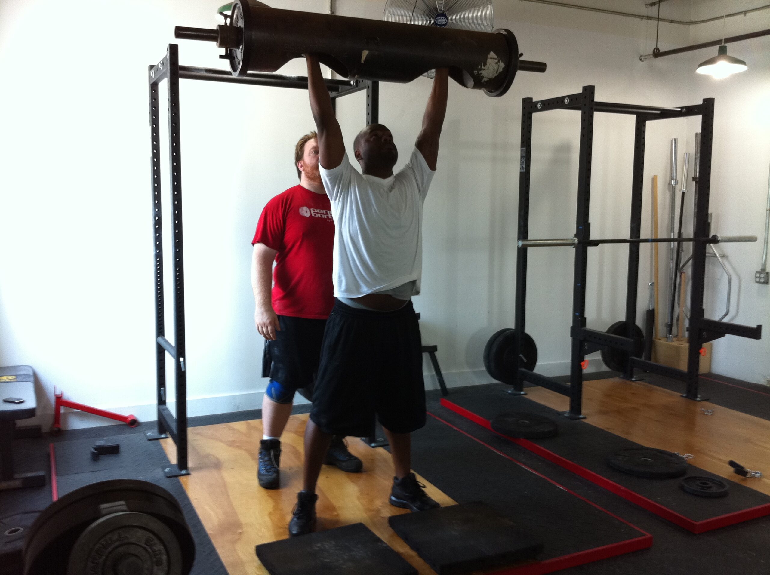 ding weight to this seemed crazy! Mike instructed us in the technique behind the log press. Once you got it onto your legs, you simply rolled it towards you and onto your chest. From there, all you had to do was press it above your head. That’s it. Easier said than done. Talk about awkward!!! We had a great time watching each other pick up this monster. It humbled all of us, men and women alike. 🙂