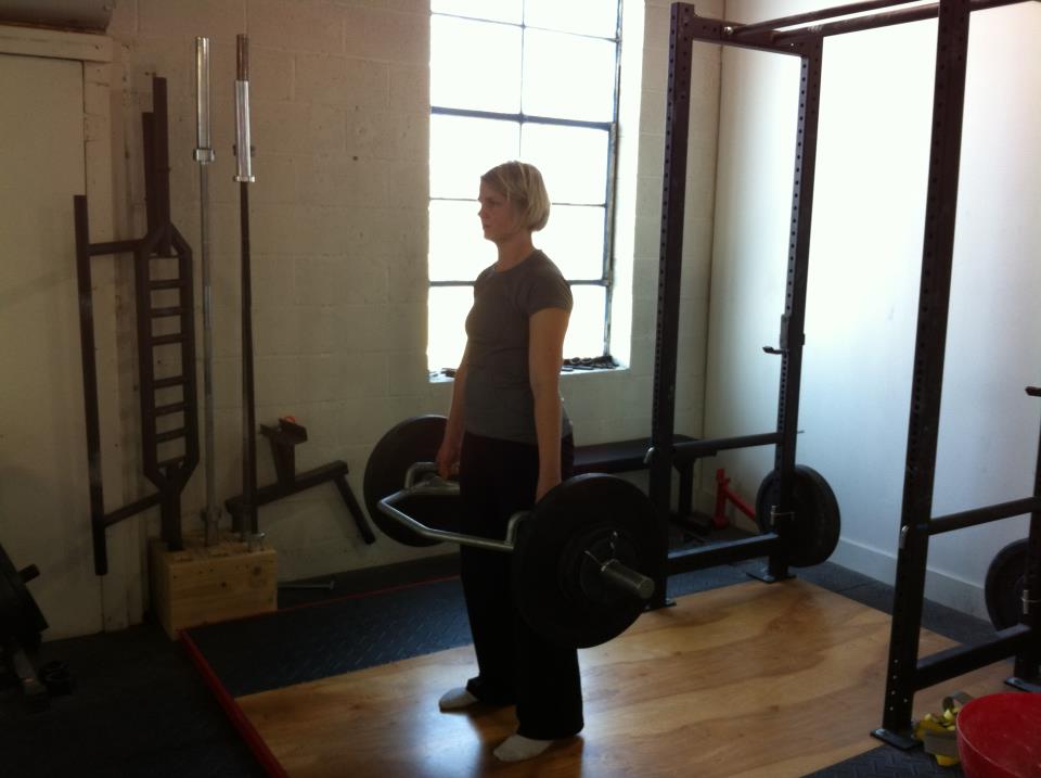 In my Basic Training class, due to the nature of the class, we stick with kettlebells, single or double. But in my All Strength Class, we teach the barbell deadlift. Only problem is, for many of my lifters, setting up in a good position for either the conventional or sumo deadlift is next to impossible. So what do I do? I want them to deadlift but I need them to be in the best possible and most efficient position for them. Cue the trap bar deadlift. For those of you unfamiliar with the trap bar, it is a hexagonal shaped bar which you stand inside of to pick up. There are two sets of handles, high handles and low handles. To perform a trap bar deadlift, the lifter steps inside the hollow portion of the bar, pushes the hips back, reaches for the handles, stands up holding the bar, lowers it the ground and repeats.