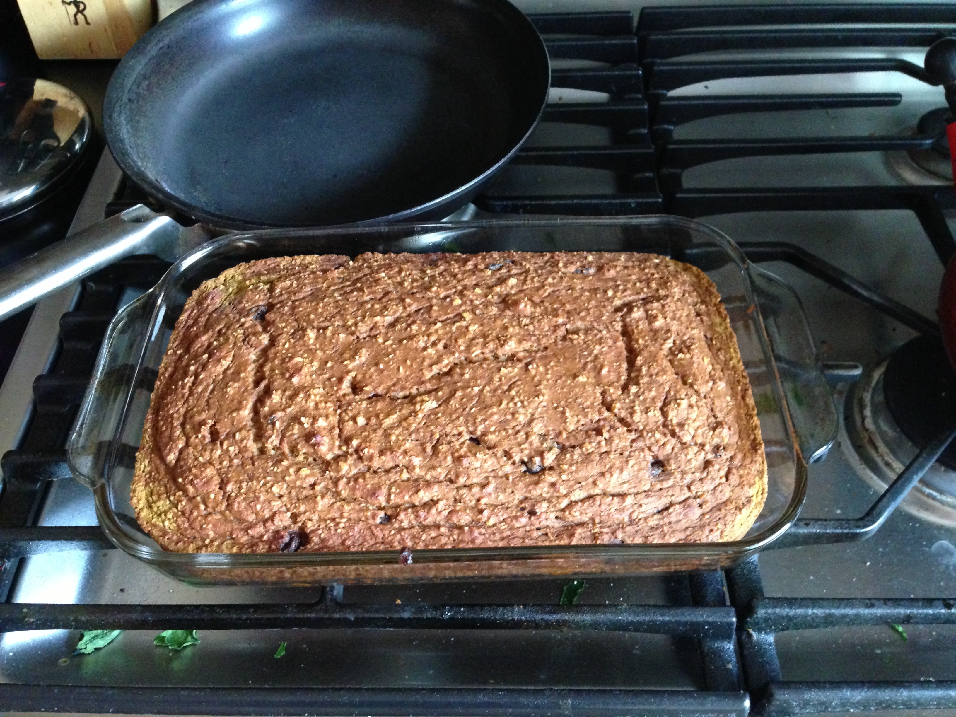 - Add the final 3 ingredients (4, if adding walnuts), and mix until incorporated. Spread batter into the Pyrex dish and bake for 30 min.