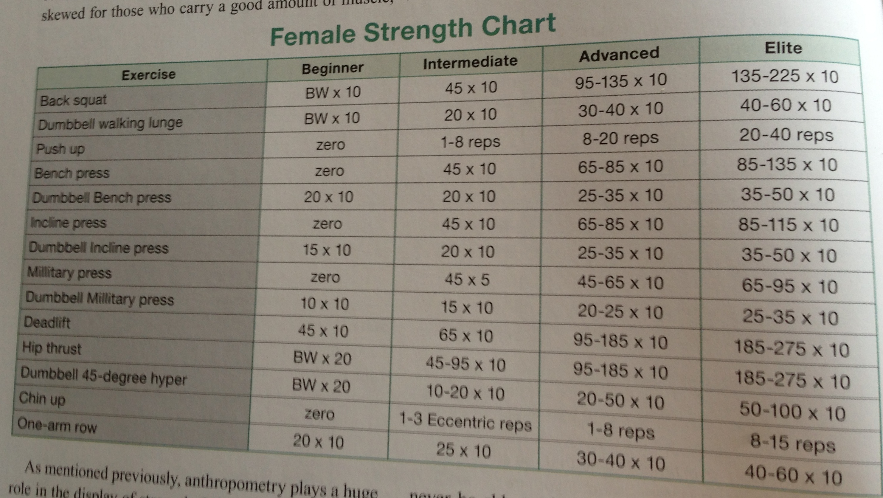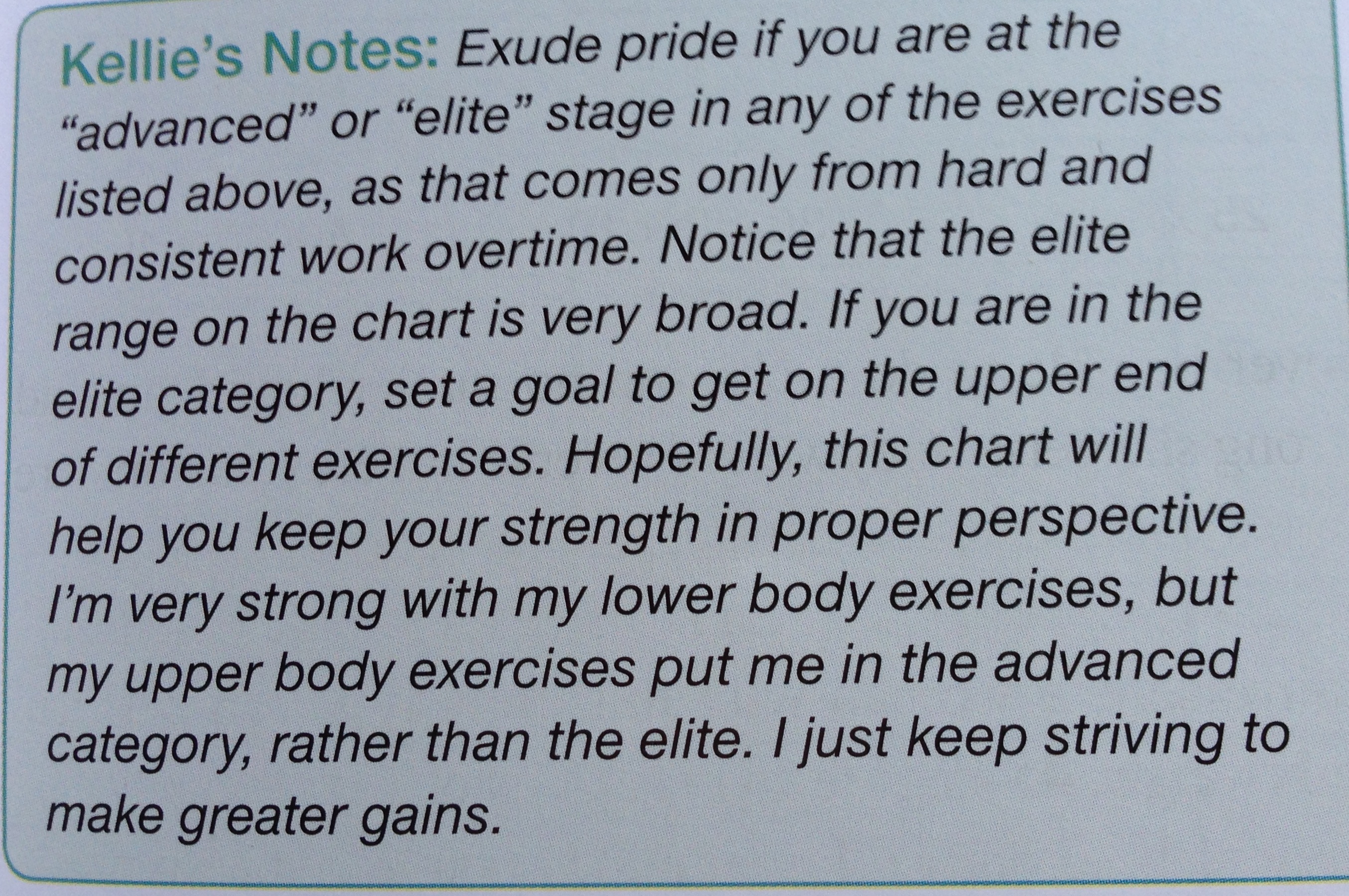 I particularly love the the Female Strength Chart because it helps you define where you are in regards to your current strength and acts as a progress chart. I really love that for most exercises, according to the chart, I fall into the “Advanced” and “Elite” categories. And as Bret says, “While I believe my strong female colleagues probably think this chart is a bit “easy,” I believe it to be accurate if you consider the entire female resistance training population.” And he is absolutely right. I loved Kellie’s note about the chart too. (See below.)