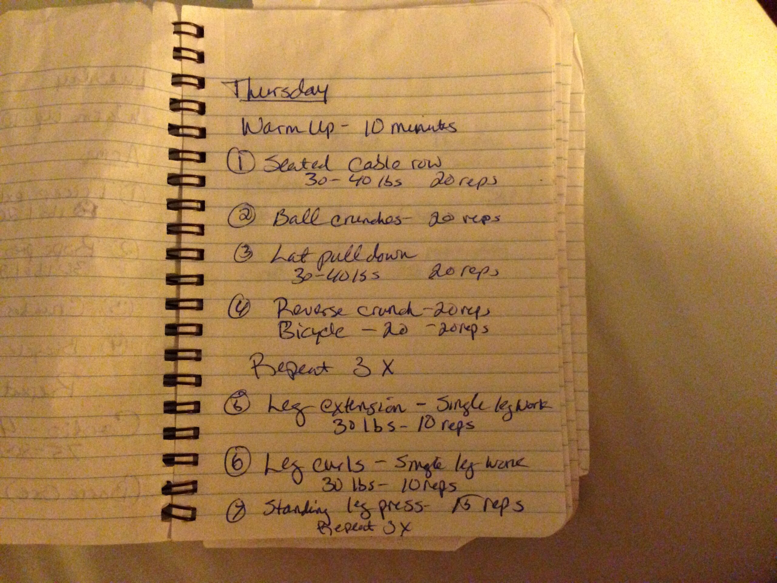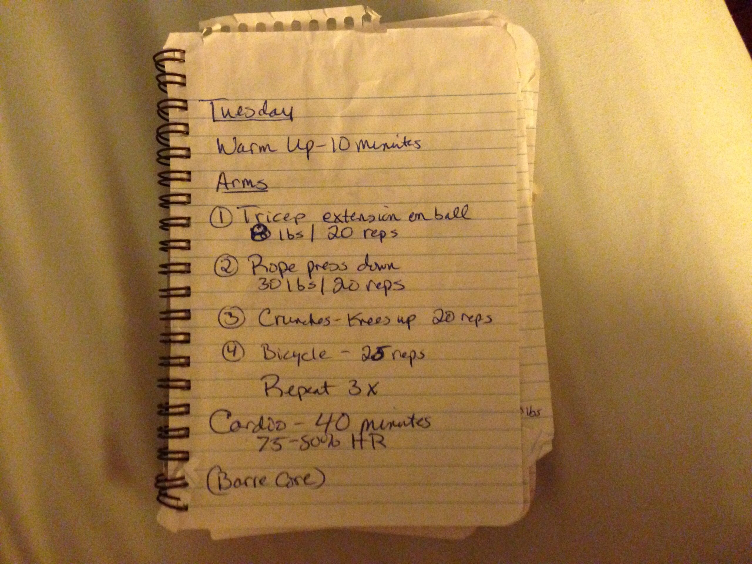 Can you read it? No, you are not seeing things. It really does say “Tricep extension on ball.” (That’s the stability ball.) Yes, it does say, “Crunches” and bicycle. Here is another day: