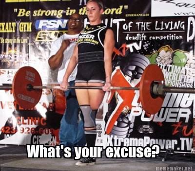 You could also, wait for it…….YOU could IGNORE the picture or quote or comment that you don’t like and actually get off your ass and get to work. You can IGNORE that picture because HER GOAL is not YOUR GOAL. I doubt that Maria’s goal is to deadlift 2x her bodyweight. Her GOAL is to look like a hot momma. Well done Maria. You did it. 😉 If your goal is look like a hot momma, well, what is your excuse for NOT looking like one? And who the fuck says that a hot momma HAS to look like that? I know some very hot mommas who don’t look like Maria and are kick ass, strong, beautiful women. It pisses me off that we as women feel the need to shut other women down for wanting to look a certain way. Knock that shit off. NOW. If you need to get up at 5:30 am to get to the gym because you really have NO other time during the day, then make the time to do it. You know those fitness and figure competitors with children? Some of them are up at 4:30am to get their cardio or strength training in because they are busy the rest of the day and they want to spend time with their children in the evening.